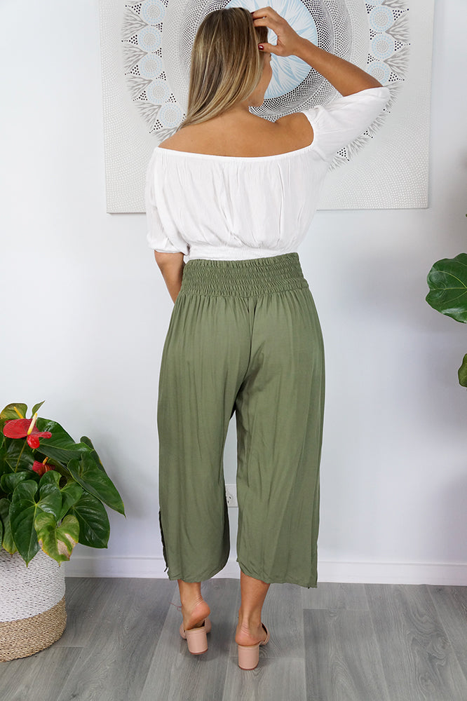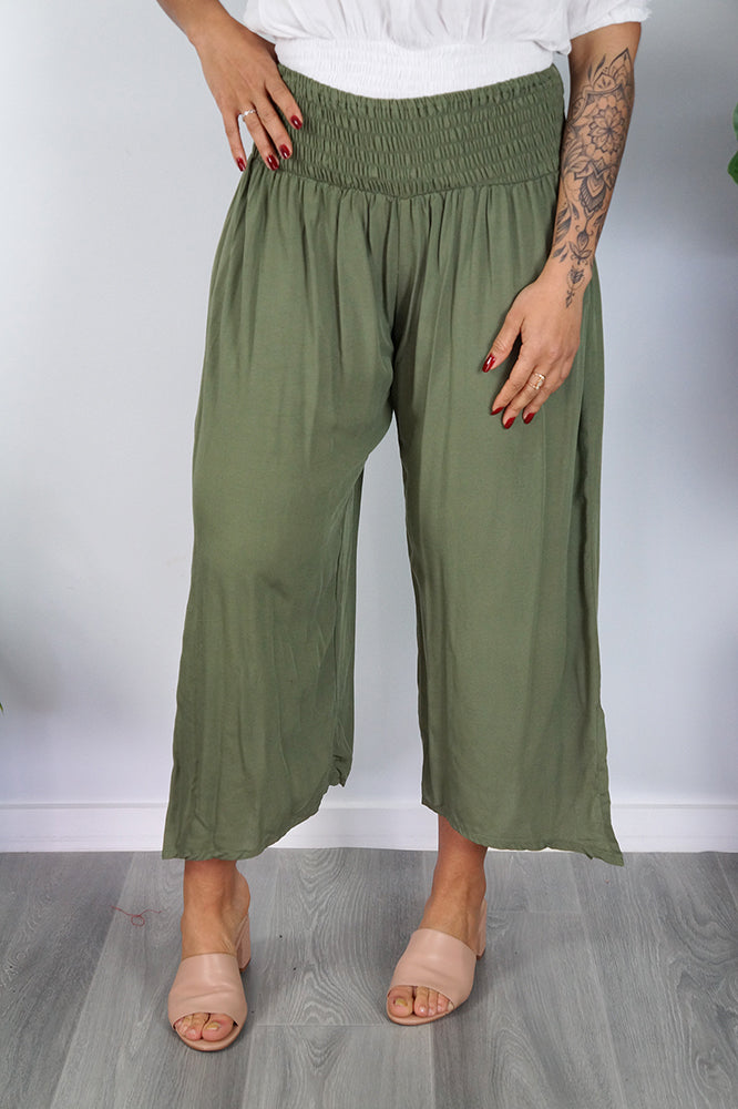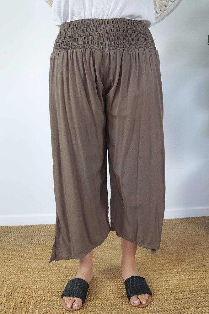 Crafted with a shirring elastic waist, wide leg, and adjustable ties, the 3/4 Bazzar pant in "Plain" colours is the perfect everyday garment for sizes 10-16.