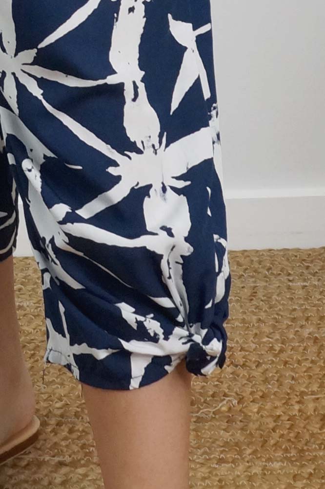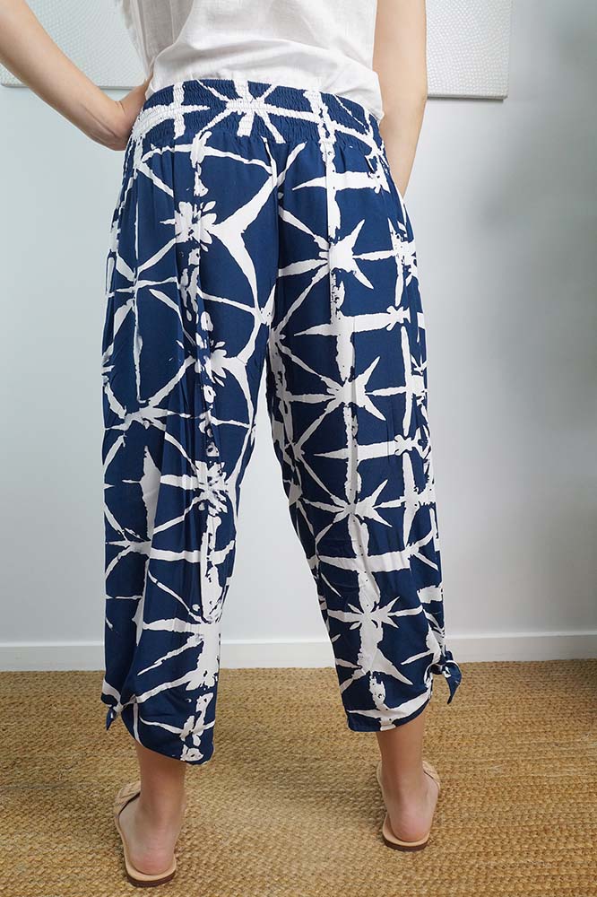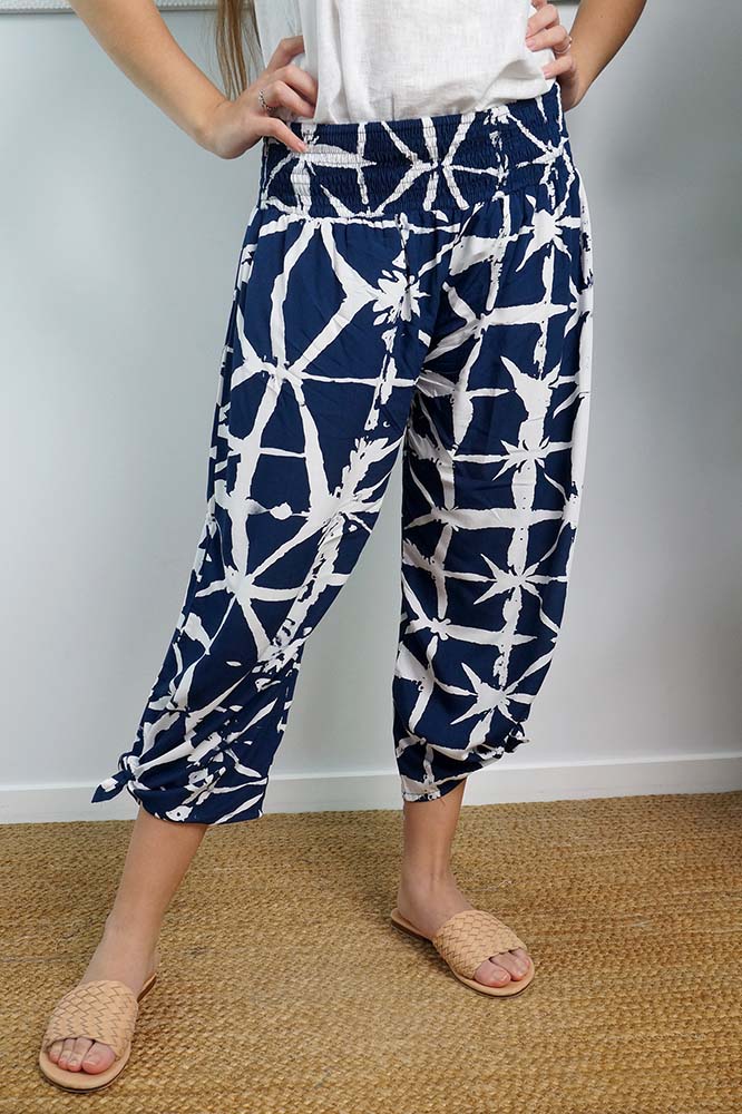 Crafted with a shirring elastic waist, wide leg, and adjustable ties, the 3/4 Bazzar pant in "Hampshire" print is the perfect everyday garment for sizes 10-16.