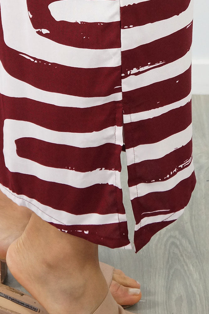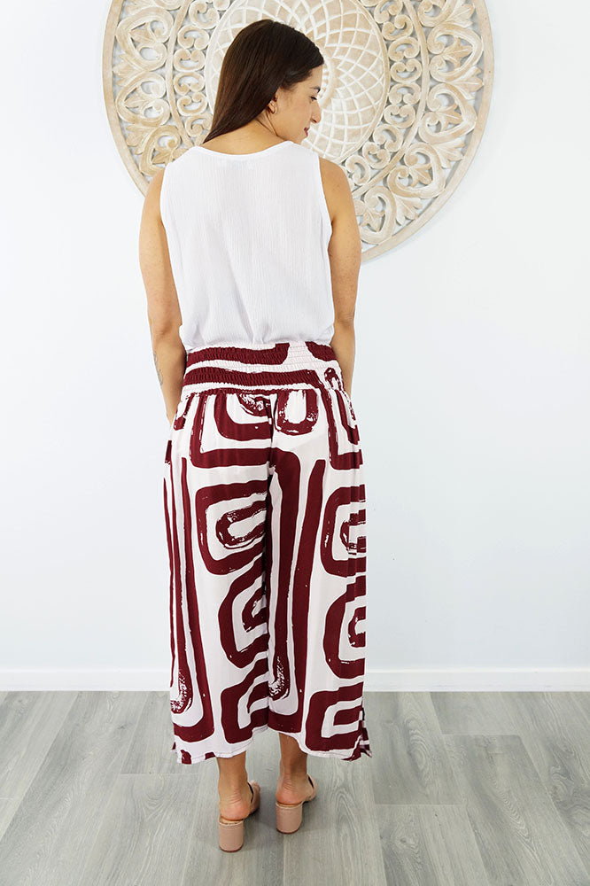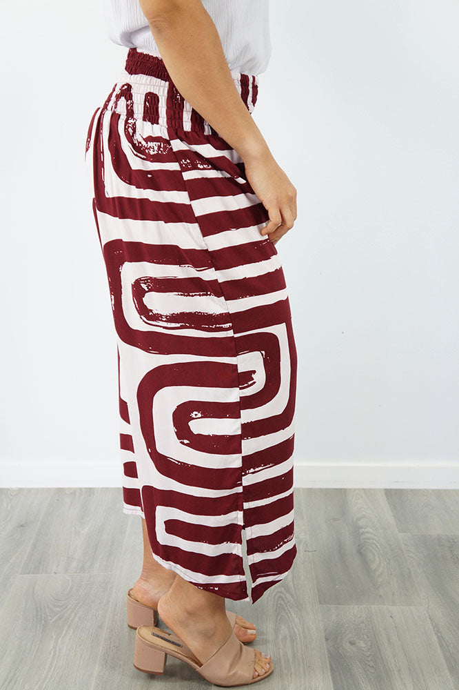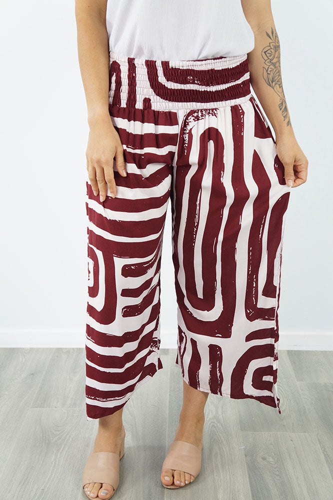 Crafted with a shirring elastic waist, wide leg, and adjustable ties, the 3/4 Bazzar pant in "Pathway" print is the perfect everyday garment for sizes 10-16.