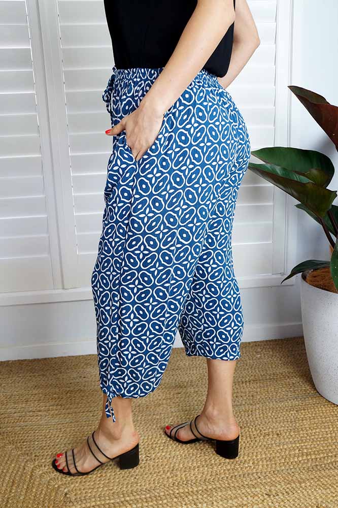 The 3/4 Links print pant, made from a comfortable crinkle rayon has elastic and drawstring around the bottom of the leg and around the waist which makes a great fit. One size to fit 10 up to size 16.