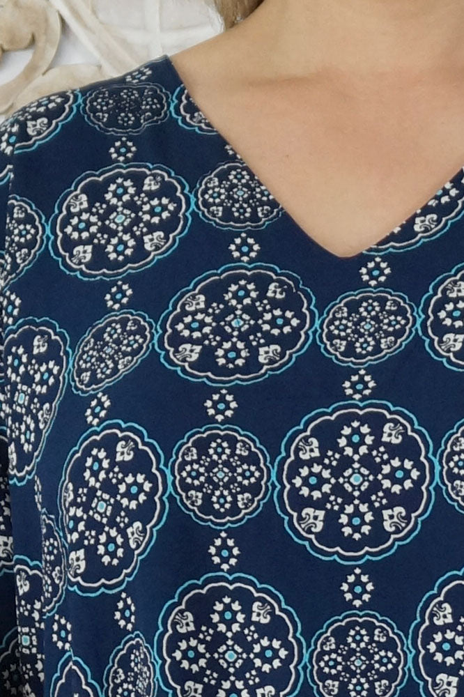 Made from rayon, this casual 3/4 sleeve tunic is great for around the pool or at the beach. Available in sizes 8-12, 14-18