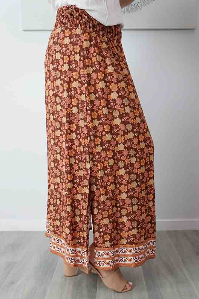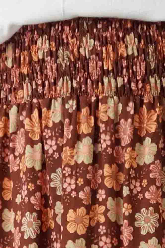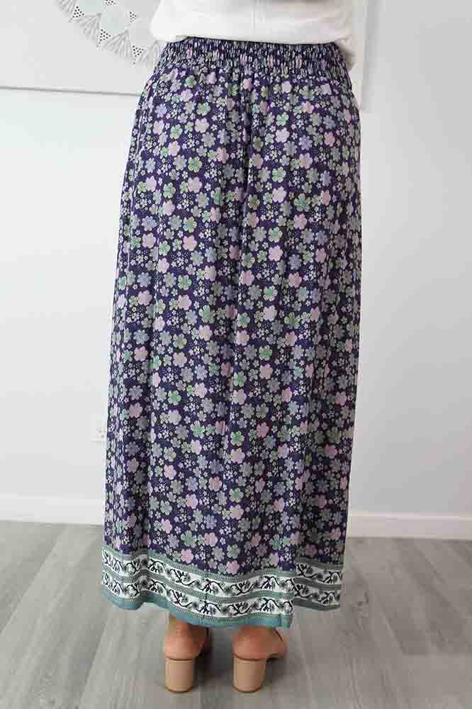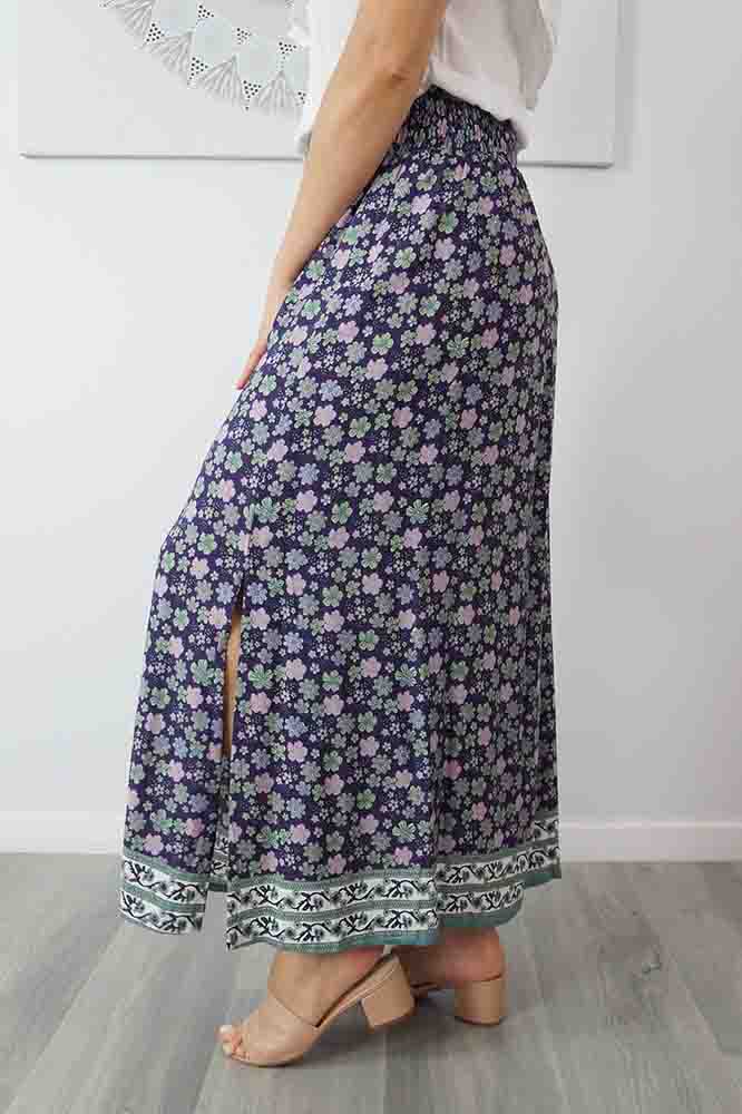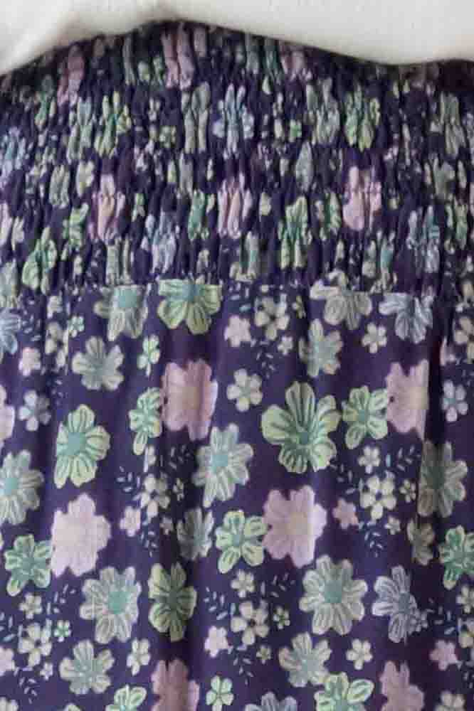 This rayon skirt features an elastic smocking waist, and splits either side. ONE SIZE TO FIT 10-16
