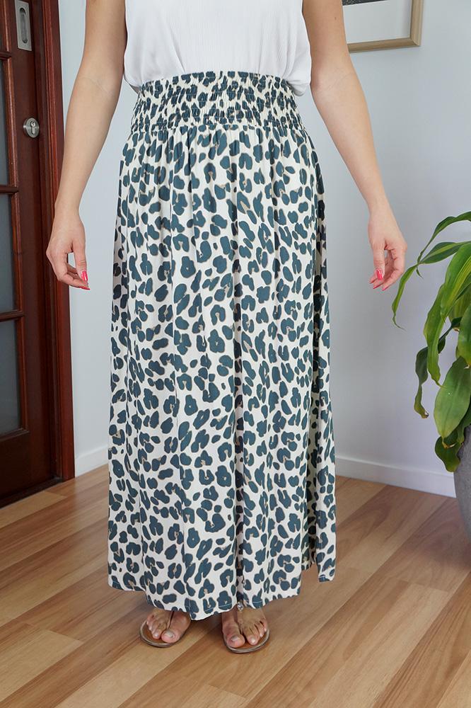 This rayon skirt features an elastic smocking waist, and splits either side. ONE SIZE TO FIT 10-16