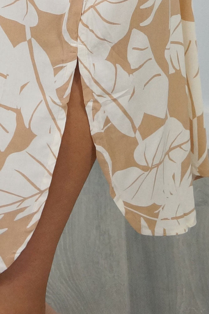 Introducing the Bermuda Kaftan in our "Leafy" print. This is a long, plus size kaftan featuring front shirring, side pockets and splits.