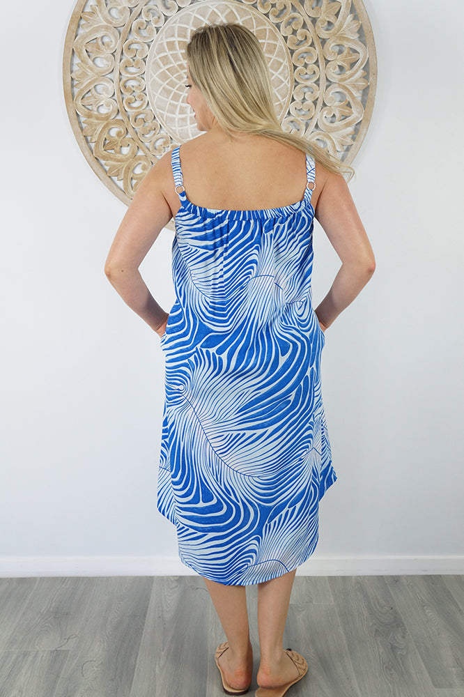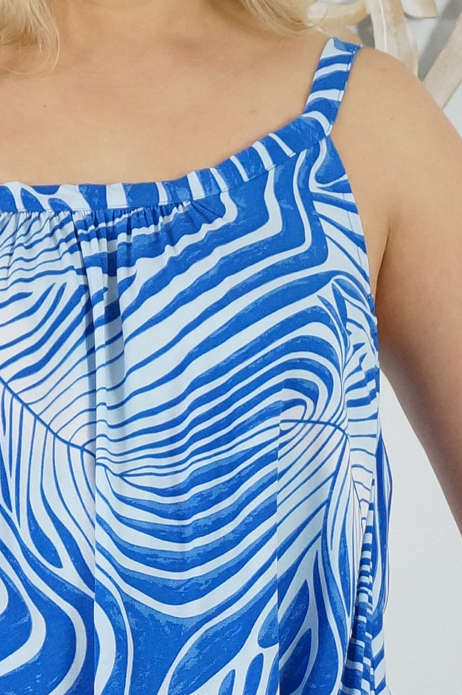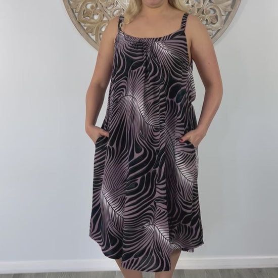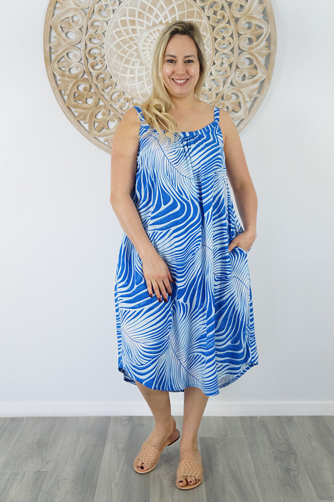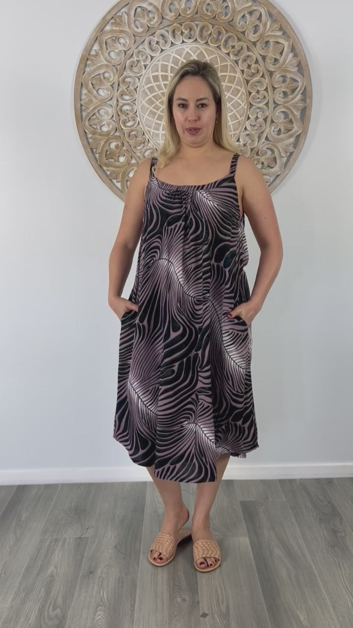 Easy fit mid length dress that falls away from the neckline. Comfortable elastic across the back and adjustable straps.