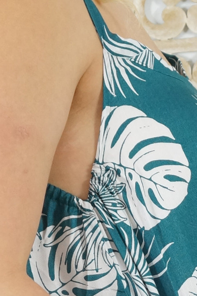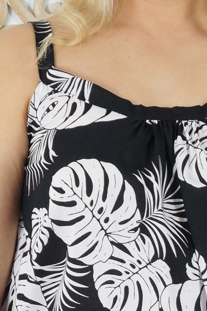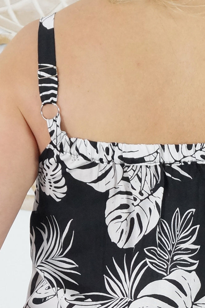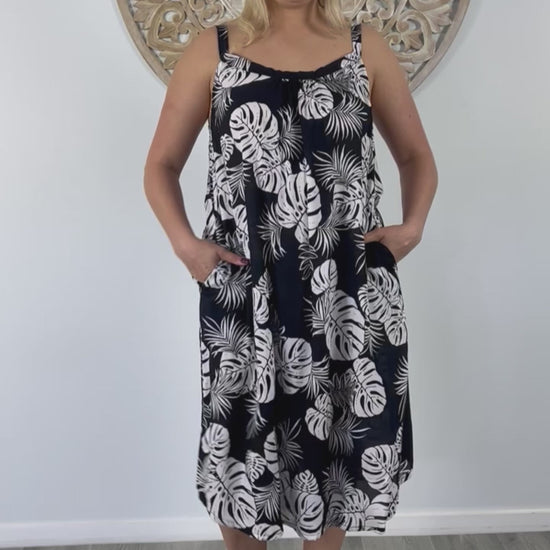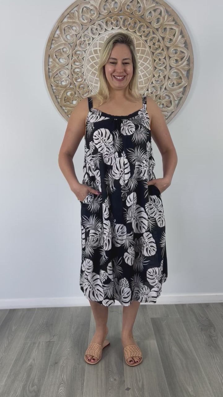 Easy fit mid length dress that falls away from the neckline. Comfortable elastic across the back and adjustable straps.
