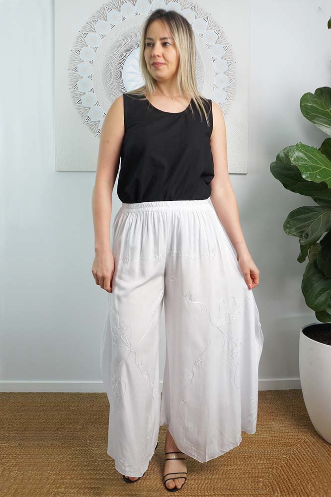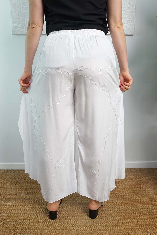 A comfortable embroidered pant with a below knee length split on each leg and a elastic waist to fit sizes 10-16.