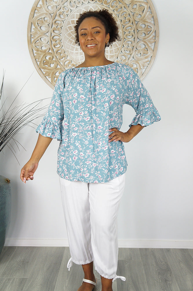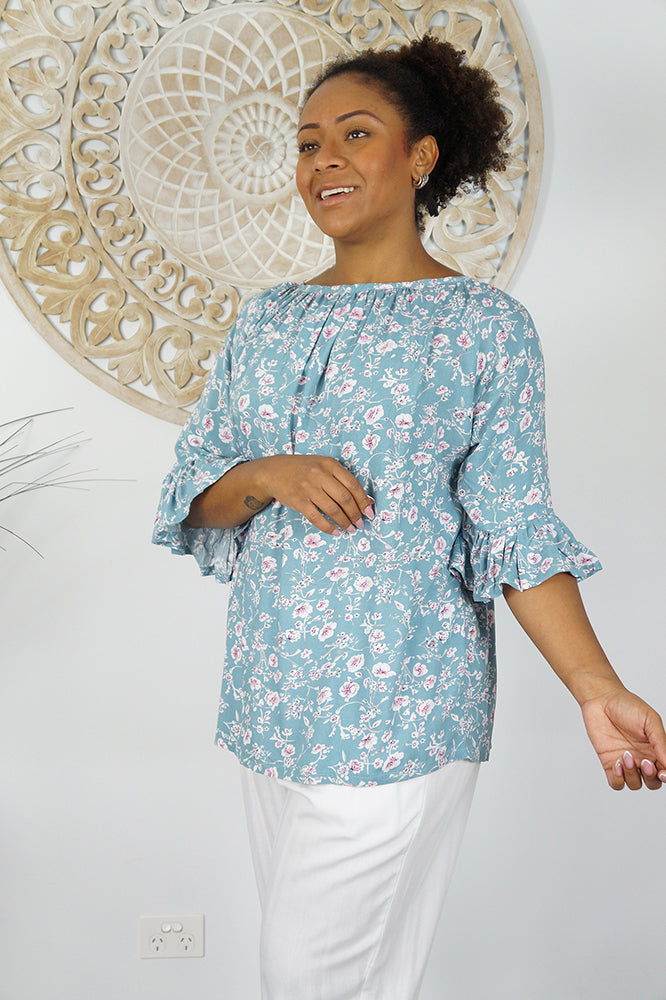Classic flat rayon style Top in "Springflower" print with bell style arms and round neckline. Available in 2 sizes.
