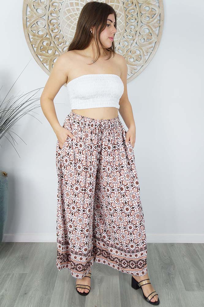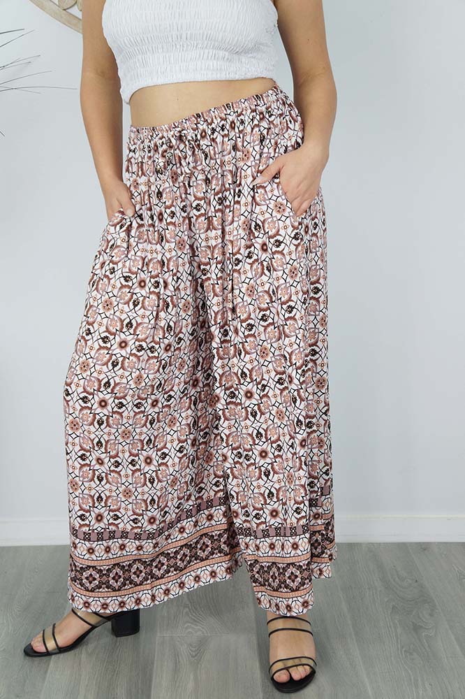 The Cha Cha pant is 100% rayon and one size to fit 10-18. With extra wide flowing legs, pockets and an elastic waist, this has got to be the most comfortable pant yet.