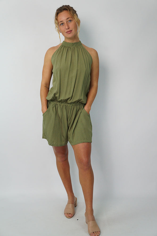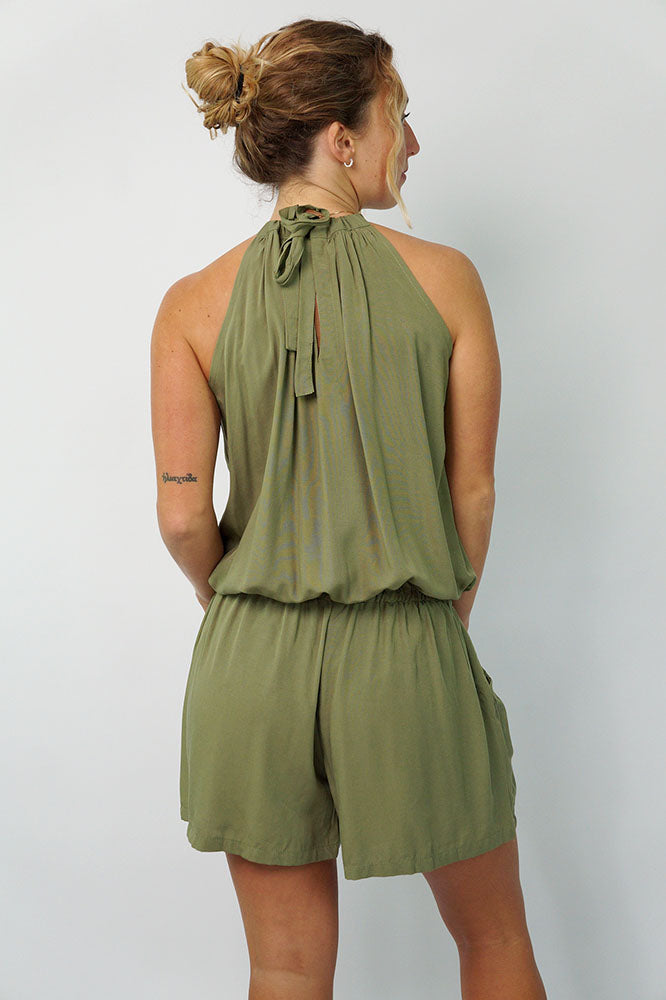 The halter neckline on the Chloe Jumpsuit is an elegant way to show your shoulders. The adjustable tie at the neck, side pockets and the elastic waistband make this jumpsuit a flattering style for all shapes and sizes. Available in 2 sizes; 8-12 and 14-18.