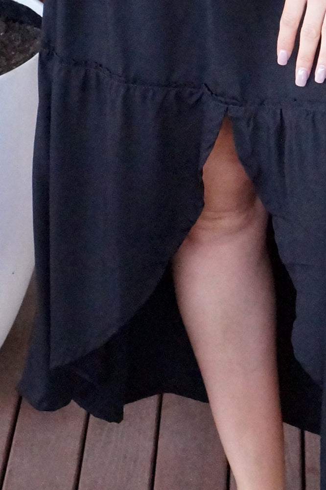Featuring a V-neckline, relaxed sleeves & tiered gathered layers down to a front split.