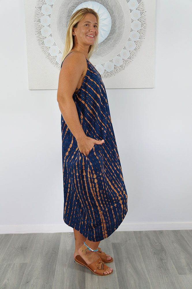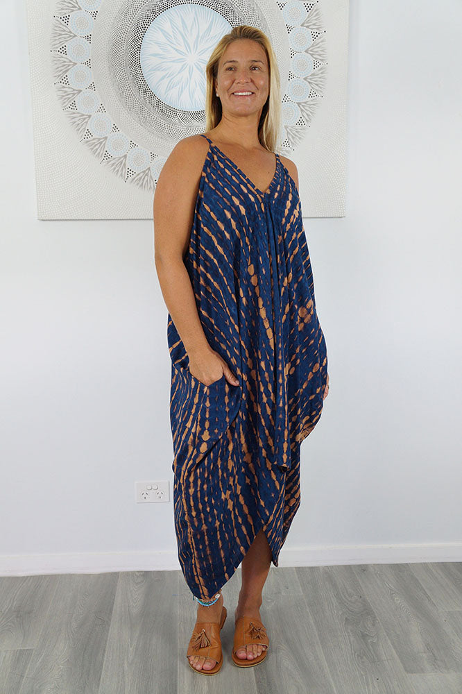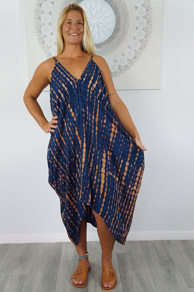 Featuring a V neckline front & back, elastic easements under the arms which ensures an comfortable fit. Side pockets and a handkerchief styled hemming to suit any body shape.