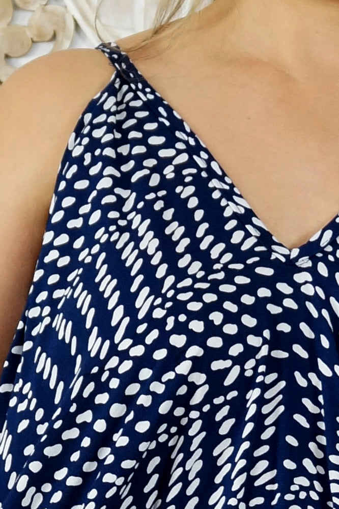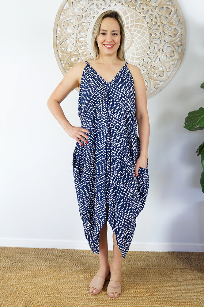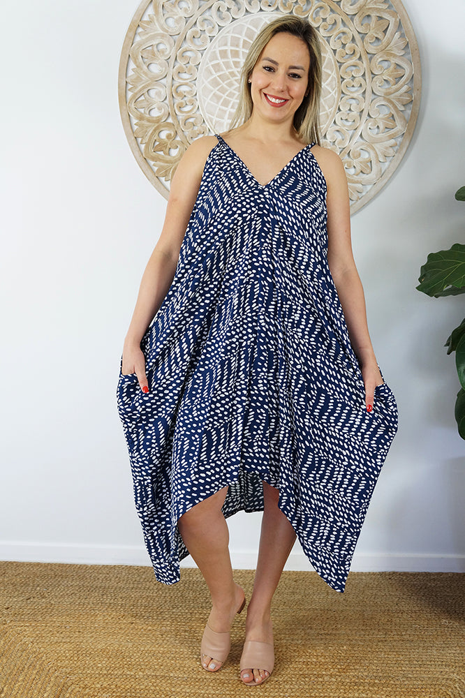 Featuring a V neckline front & back, elastic easements under the arms which ensures an comfortable fit. Side pockets and a handkerchief styled hemming to suit any body shape.