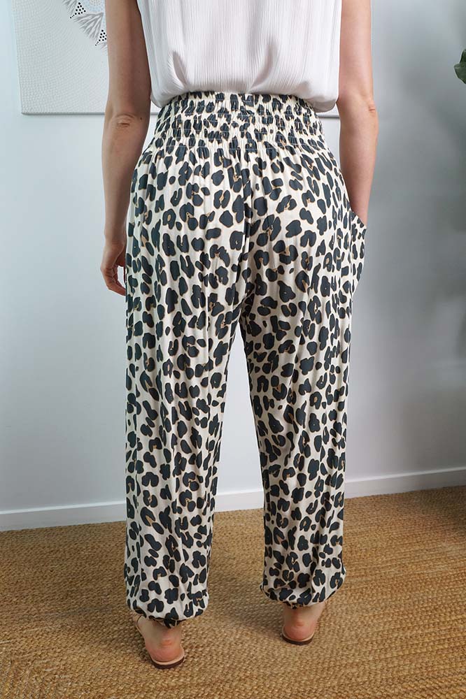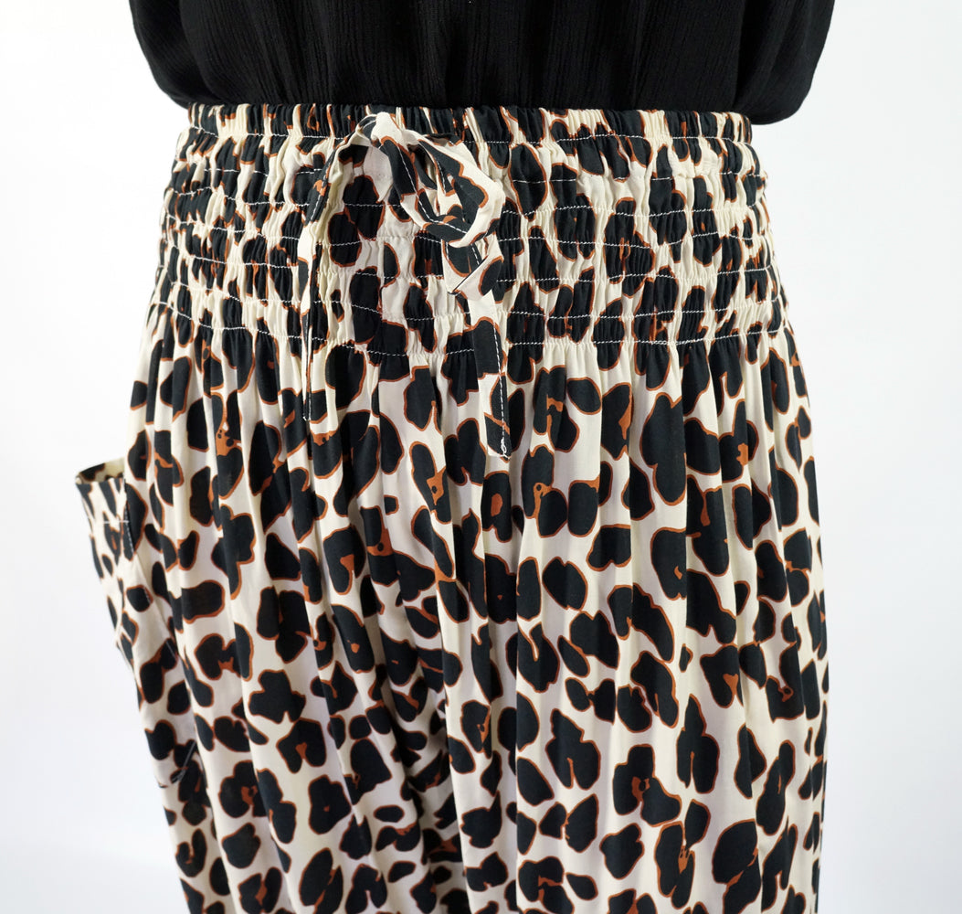 The Harem pant is 100% rayon and 100% comfort, with shirring around the waist and elastic around the ankle. 3 sizes available. Free size to fit 10-16, 18-20 and 22-24.