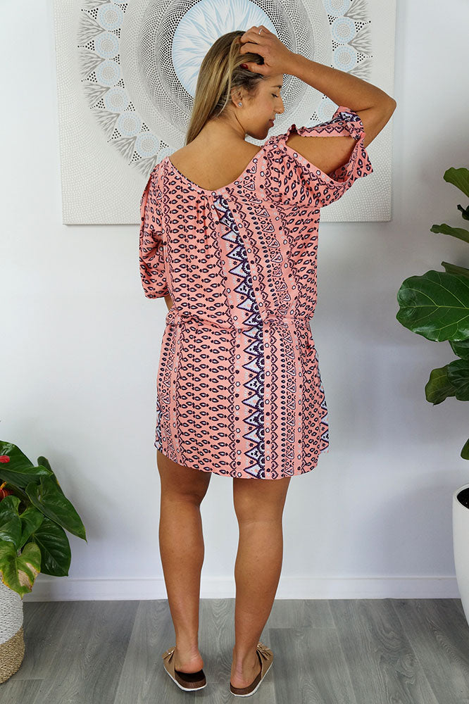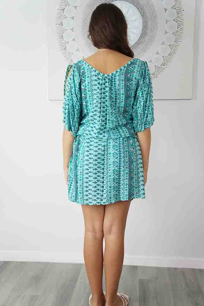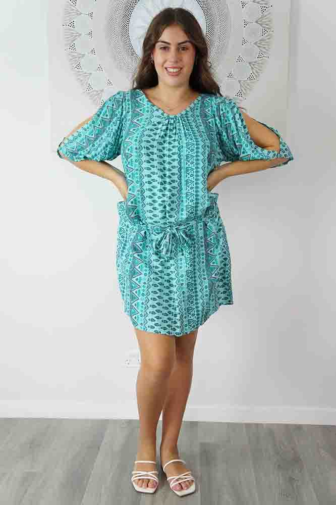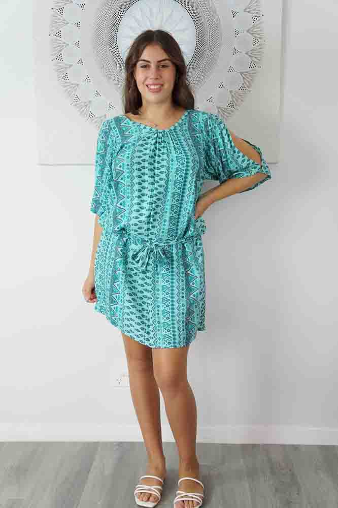 Made from a cool rayon with open sleeves and a matching fabric tie for around the waist this dress is perfect for summer.