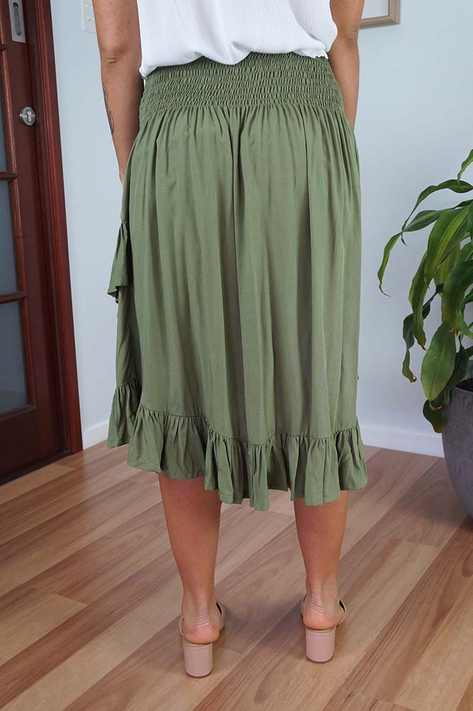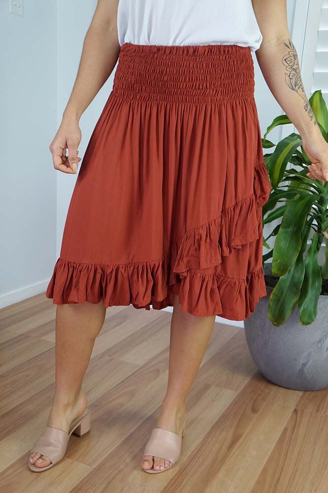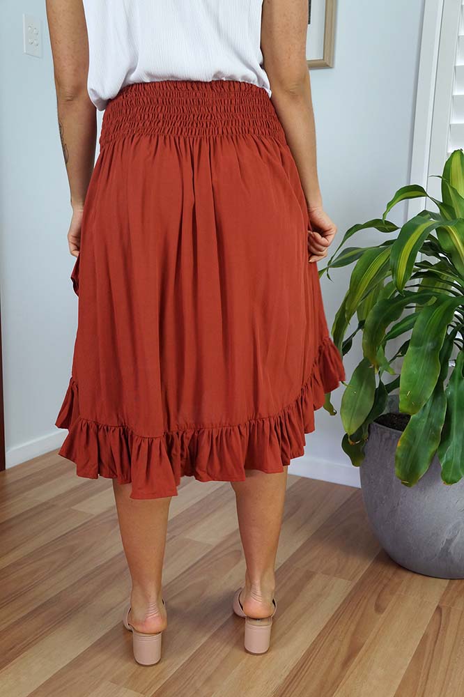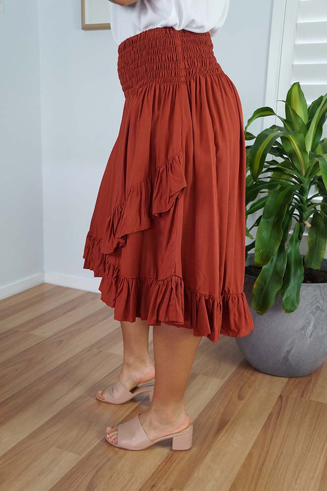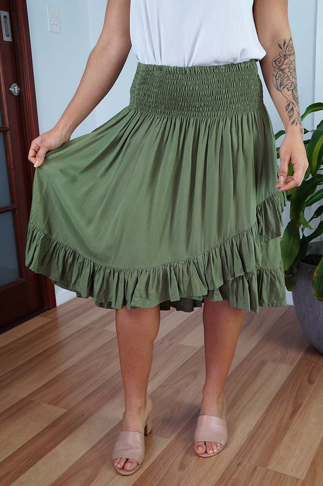 This rayon skirt features an elastic shirring waist, and curved frilled edging.