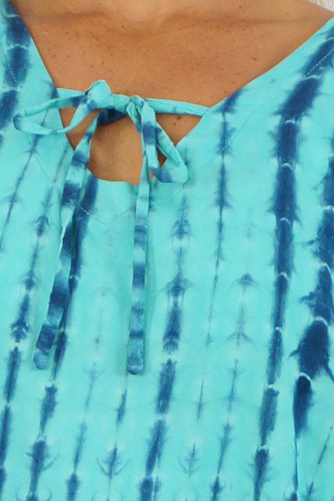 Wear it as a top, a dress, or a tunic over bathers, this product is a complete outfit. A cute tie on the neck line compliments the free flowing figure, while batwing style sleeves give your arms space to move freely.