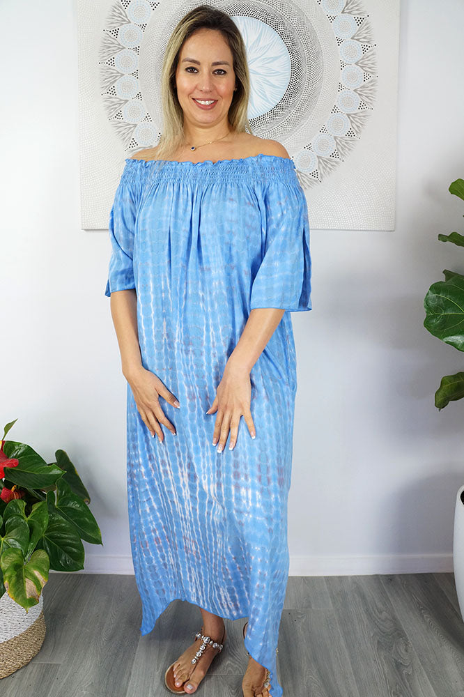 An elegant and comfortable dress featuring elastic shirring on the neckline and splits on the sleeves. ONE SIZE TO FIT 10-16