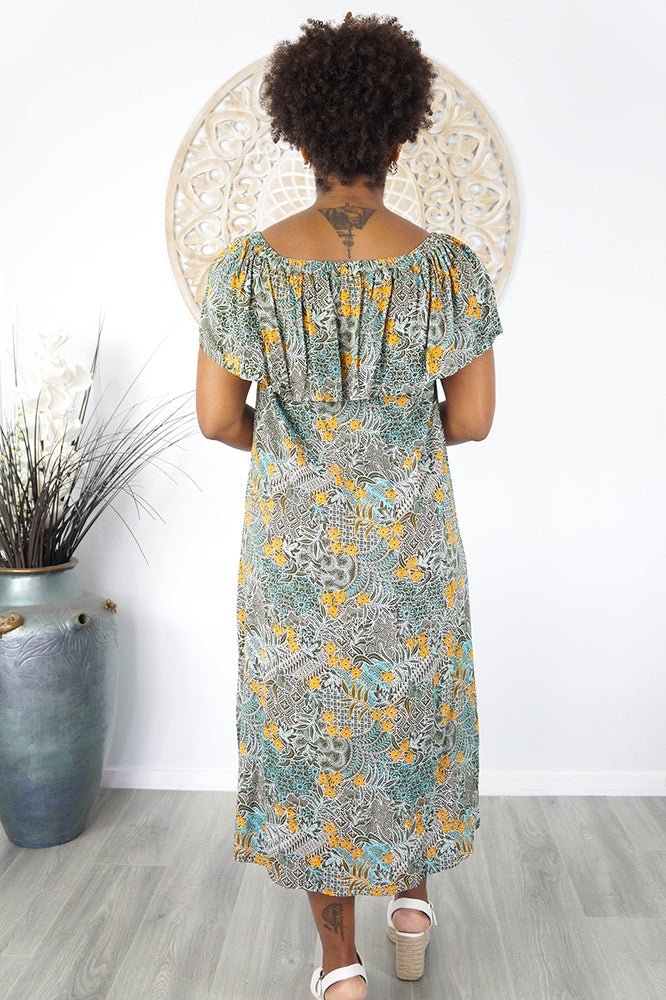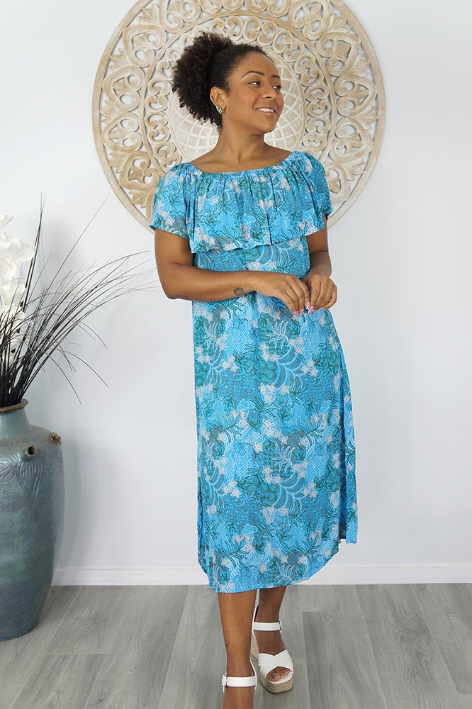 Cool and comfortable off the shoulder dress with frill detail in a lovely pre shrunk crinkle rayon. Free Sizing 8-16