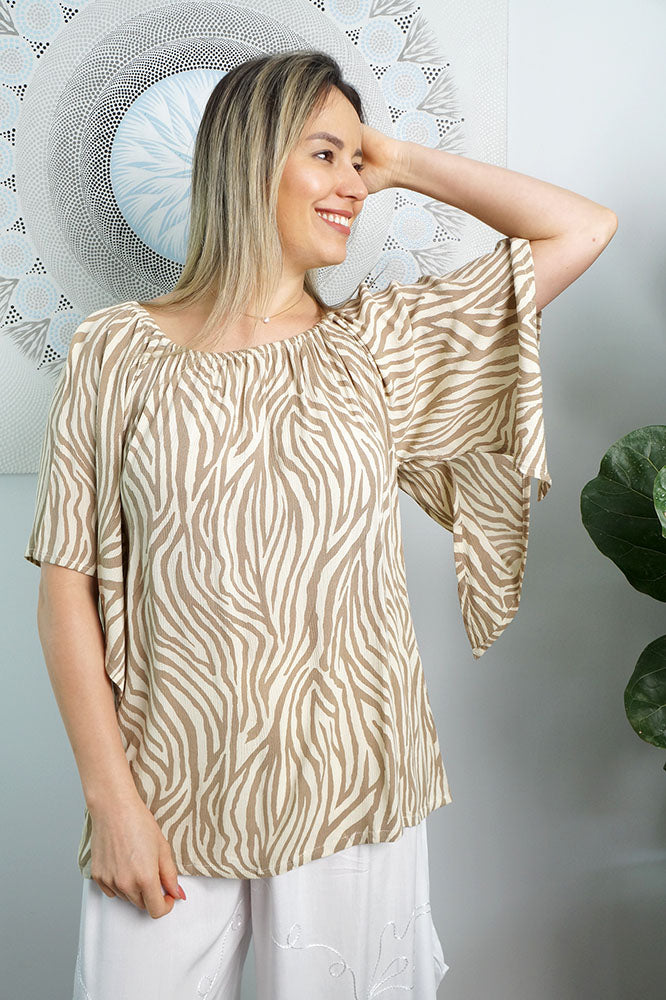 Made from crinkle rayon, featuring elastic around the neck line for an on or off the shoulder look along with angled split sleeves.