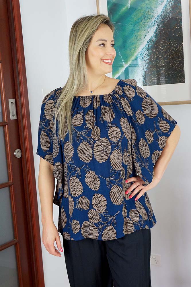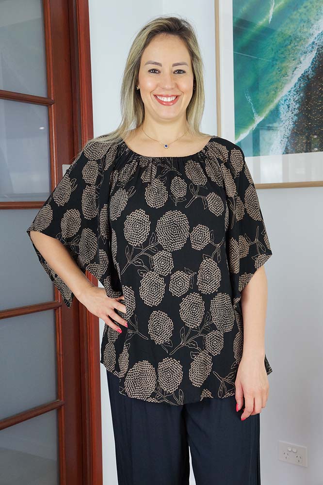 Made from crinkle rayon, featuring elastic around the neck line for an on or off the shoulder look along with angled split sleeves.
