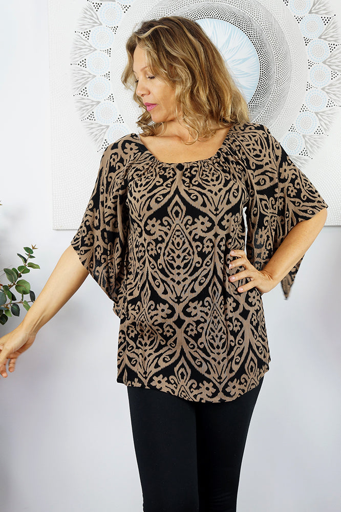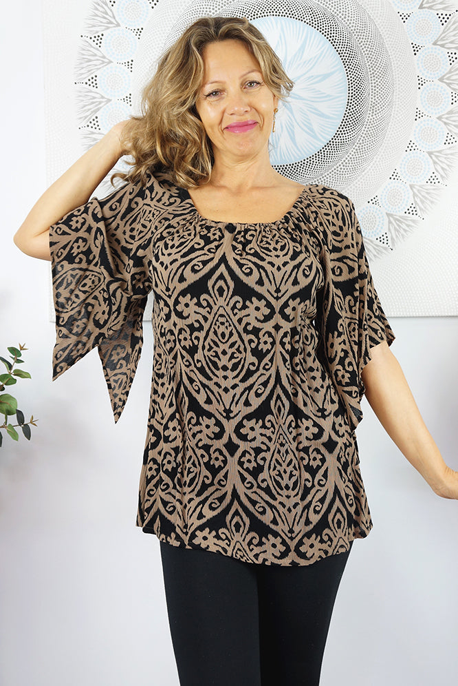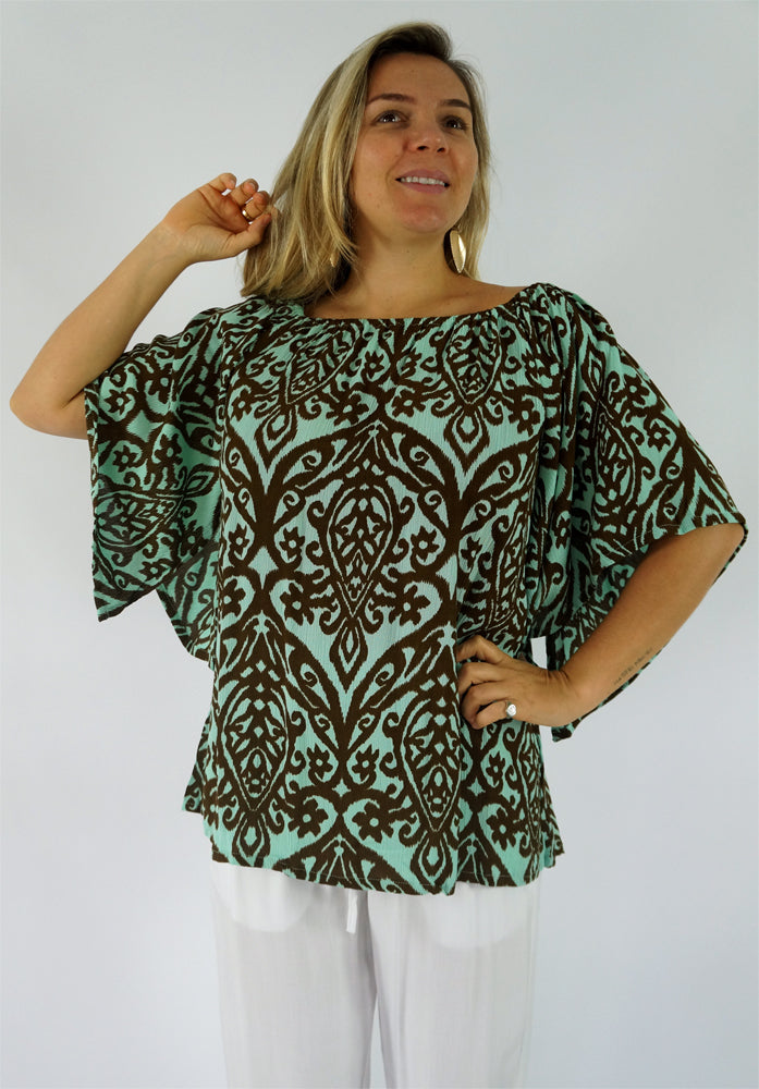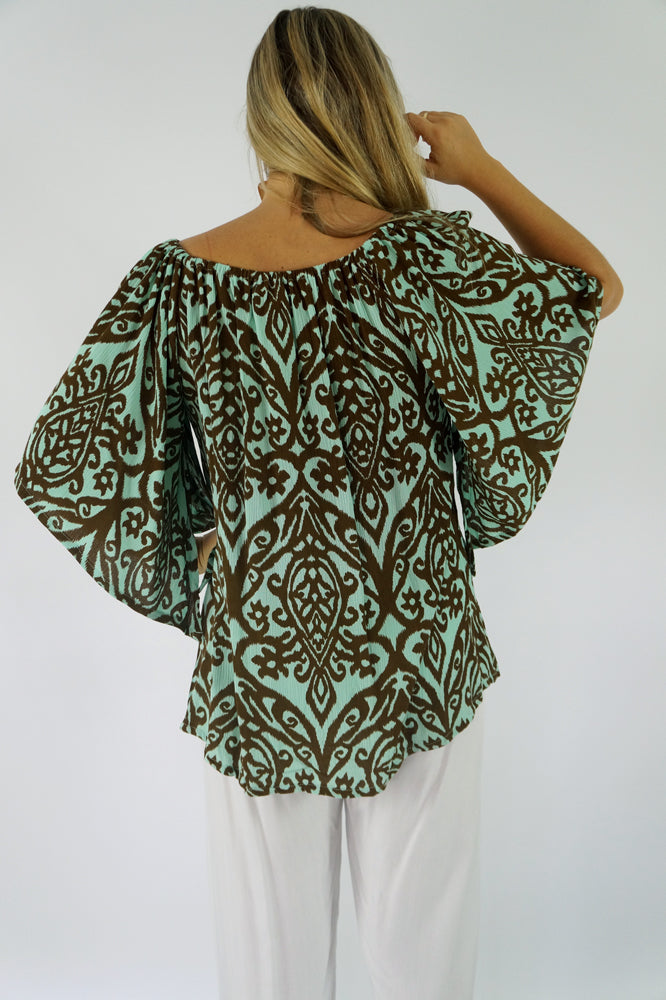 Made from crinkle rayon, featuring elastic around the neck line for an on or off the shoulder look along with angled split sleeves.