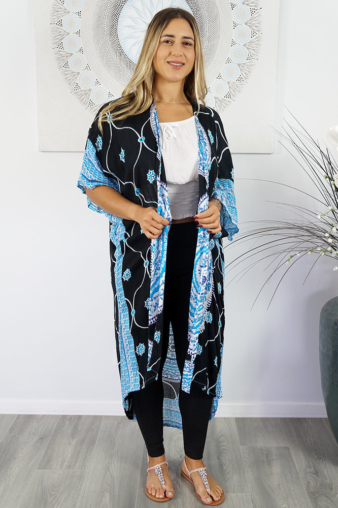 A comfortable way of getting about or on the beach, this all rayon and sequined cape suitable for sizes 10 to 18. Finished length on the back s approximately 120cm, and 90cm on the front.