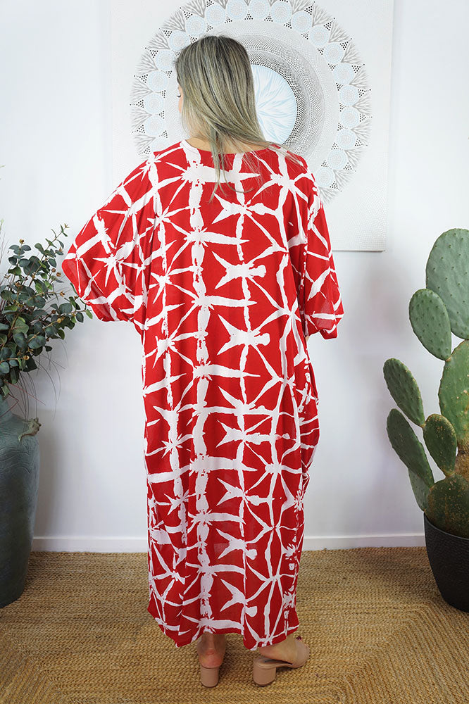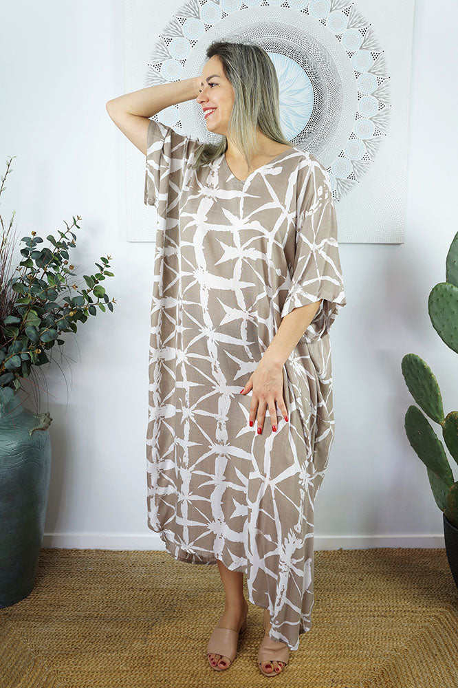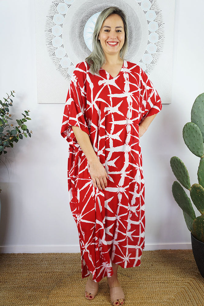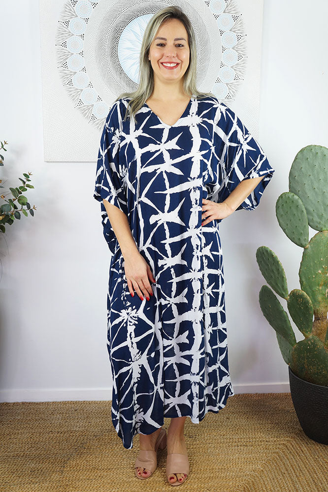 Our kaftans range from rich solid colors to funky patterns. A simple v-neck in the front, side splits on the bottom and a free size from 10-26, this product fits everyone (seriously, these fit everyone).