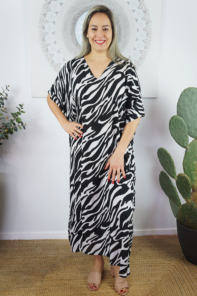Our kaftans range from rich solid colors to funky patterns. A simple V-neck in the front, side splits on the bottom and a free size from 10-26, this product fits everyone (seriously, these fit everyone).