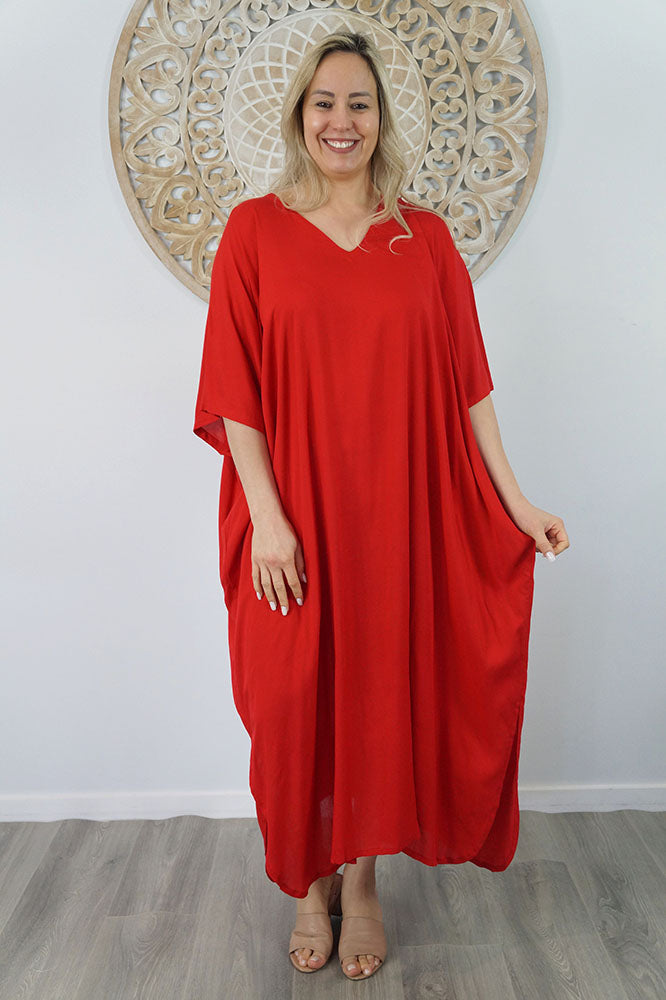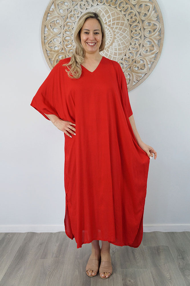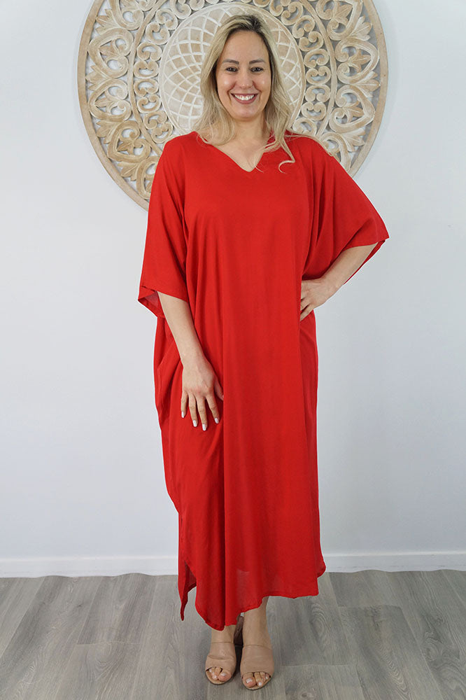Our kaftans range from rich solid colors to funky patterns. A simple v-neck in the front, side splits on the bottom and a free size from 10-26, this product fits everyone (seriously, these fit everyone).