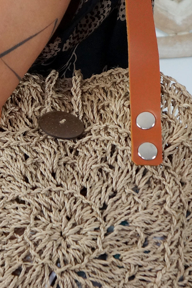 This fantastic bag is ideal for the market or beach. Measures approximately 33cm round. Made from Sea Grass with Leather straps and coconut button closure. Makes an ideal gift.