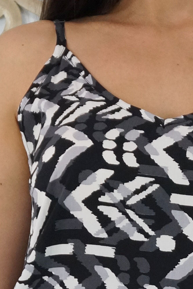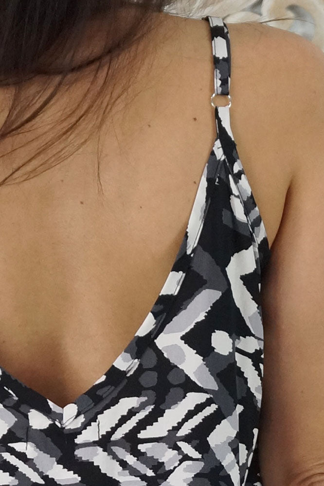 The Melody Dress Patchwork offers a comfortable and flattering fit with its adjustable straps and elastic easement under the arms. Crafted from soft rayon, it features a stylish V-neckline front and back, complemented by a frill hem for graceful movement. This dress is designed to support your day with ease and elegance.