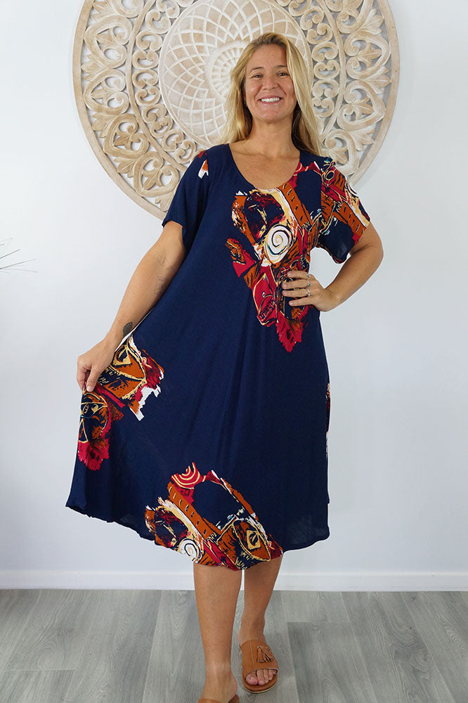 Cool and comfortable sleeved dress in lovely pre shrunk crinkle rayon. Fabric is cut of the bias to assist the garment to fit many body shapes. Free Sizing 10 - 18.