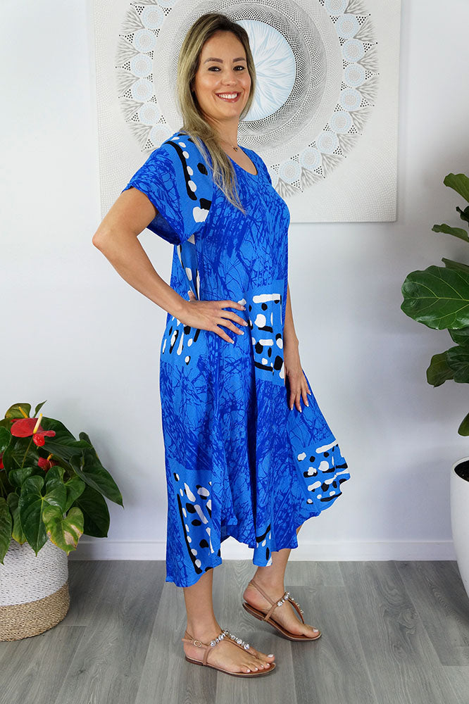 Cool and comfortable sleeved dress in lovely pre shrunk crinkle rayon. Fabric is cut of the bias to assist the garment to fit many body shapes. Free Sizing 10 - 18.