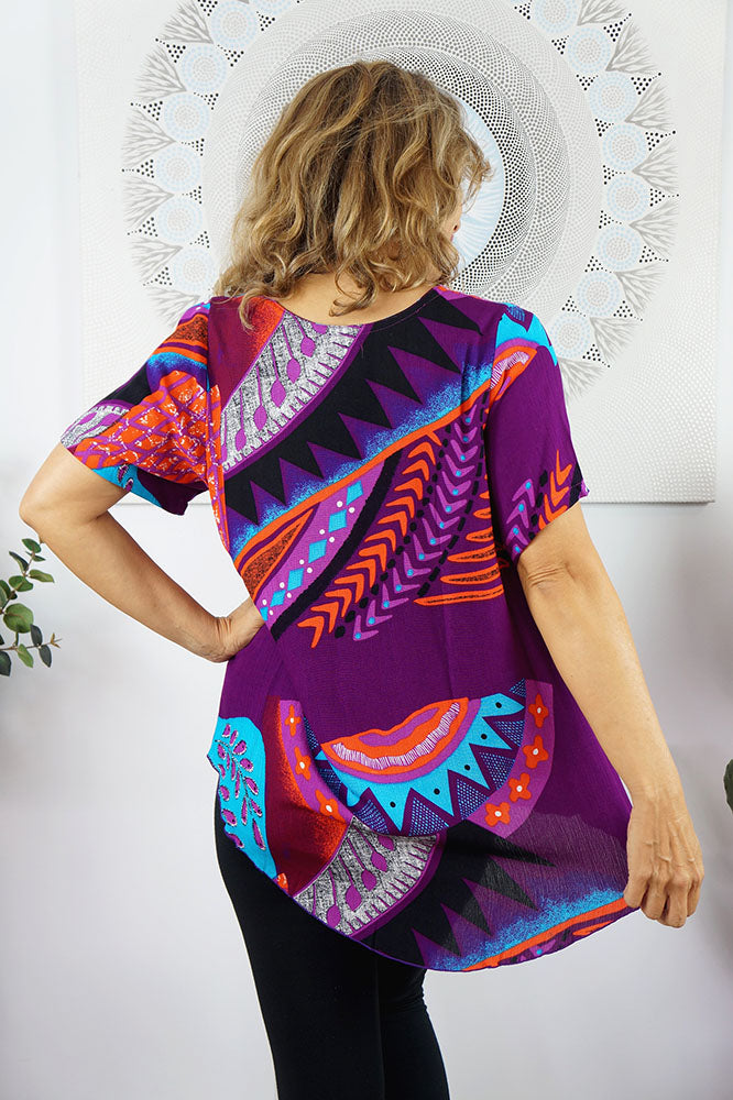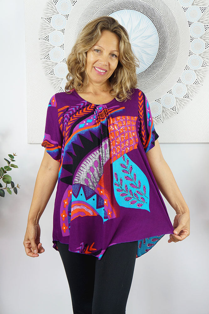 A flowy top with sleeves made from a cool crinkle rayon for those hot summer days. Sizes available 10-16, 18-22