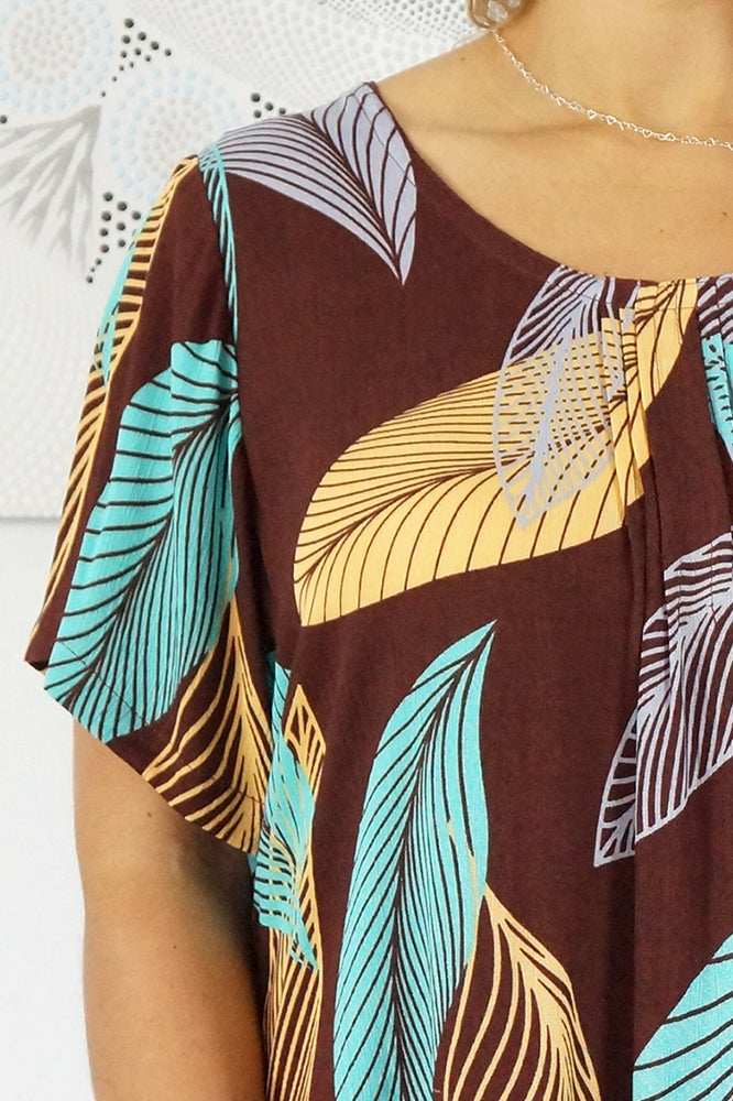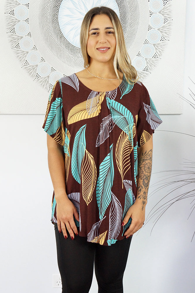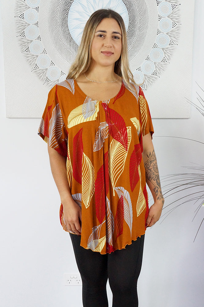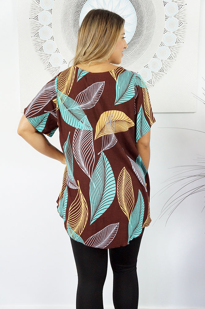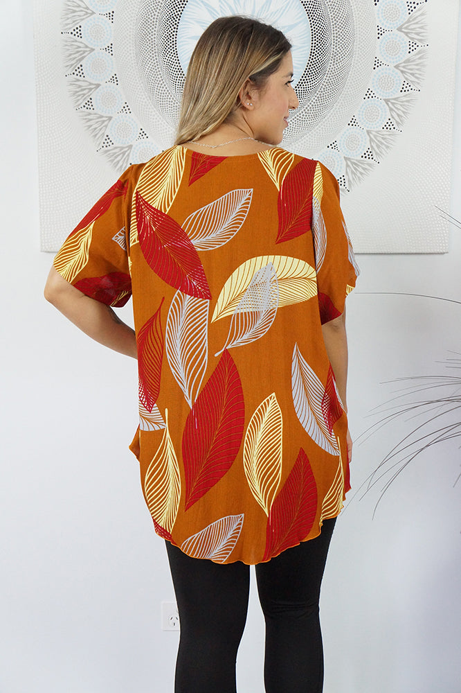 A flowy top with sleeves made from a cool crinkle rayon for those hot summer days. Sizes available 10-16, 18-22
