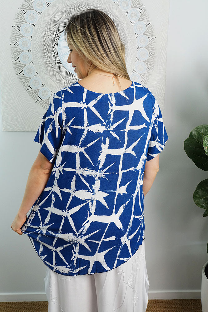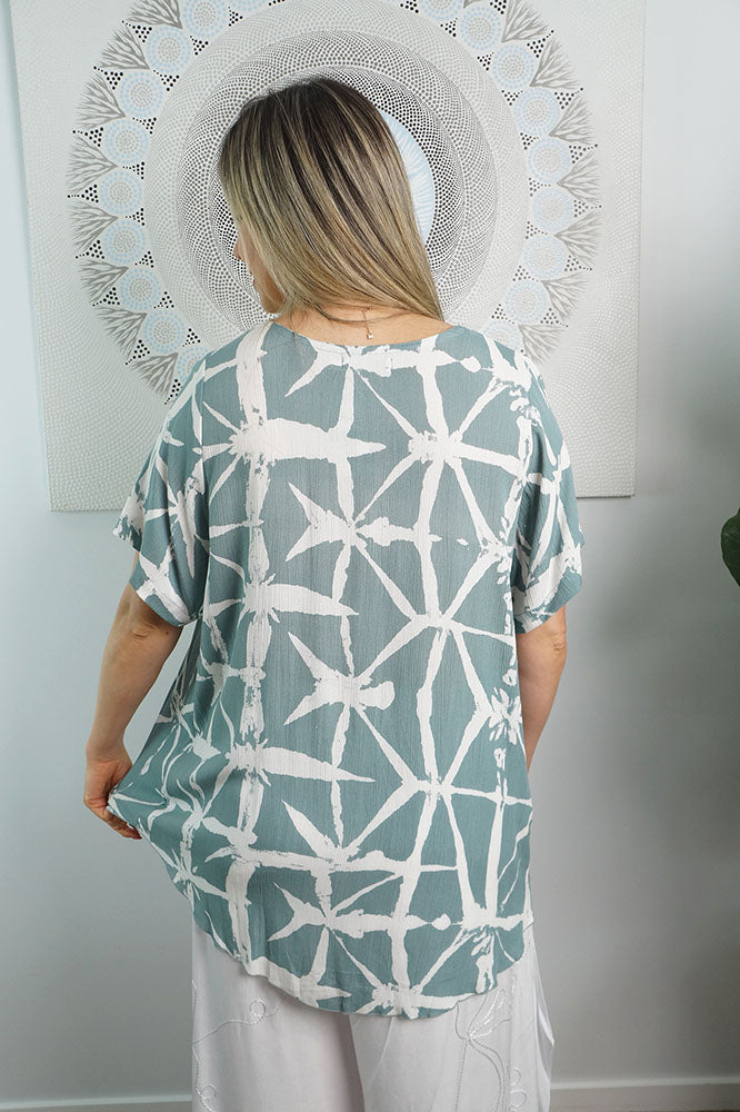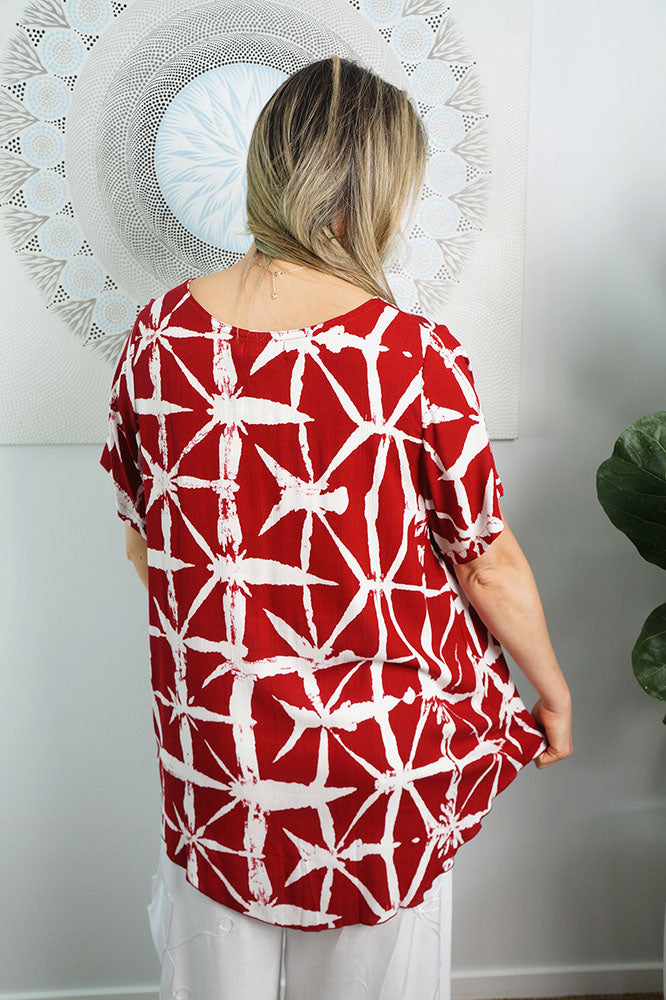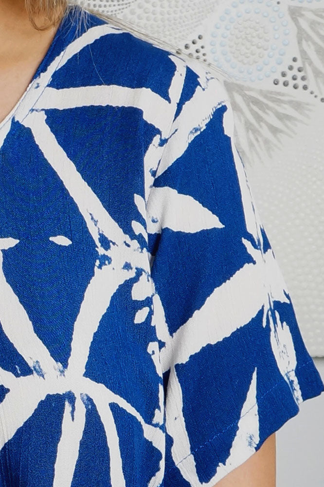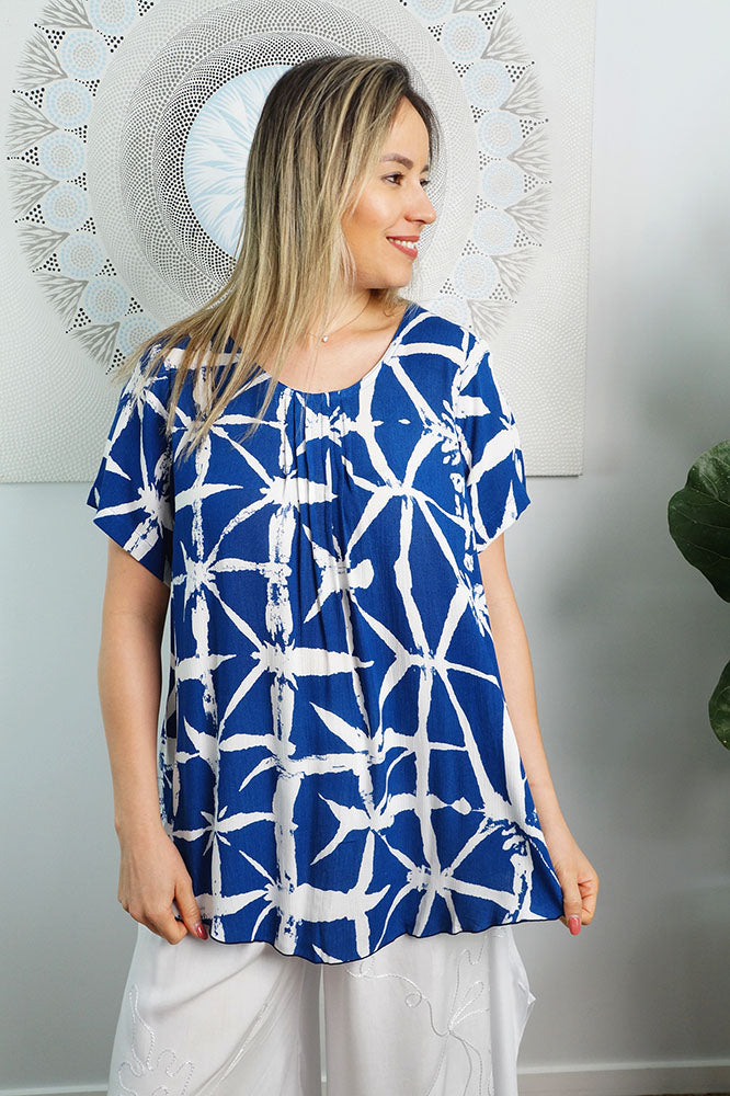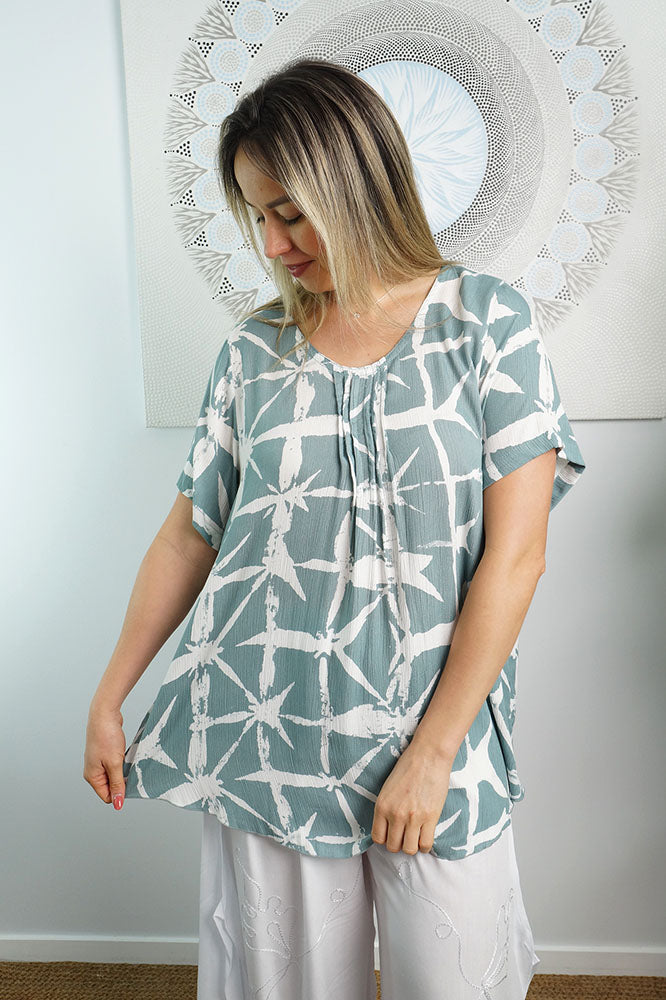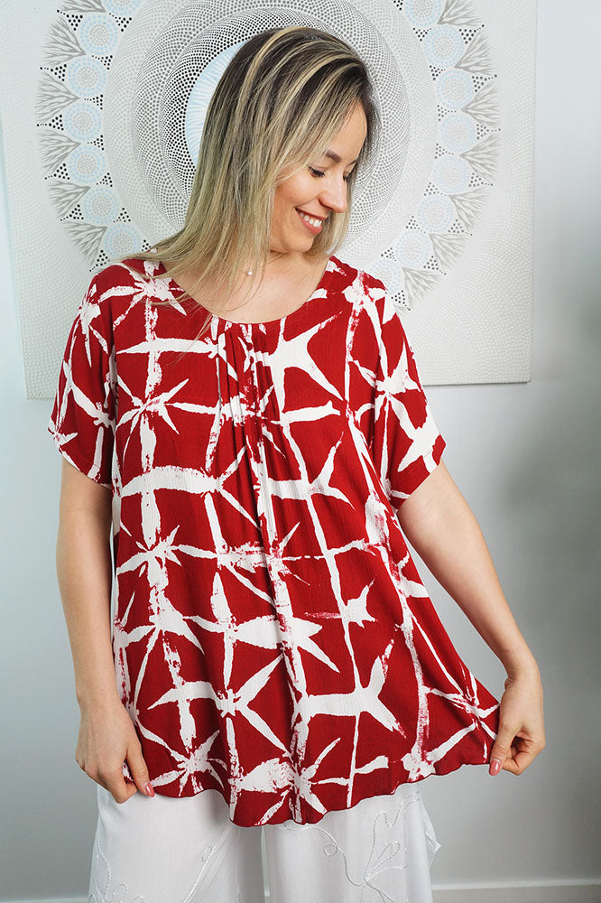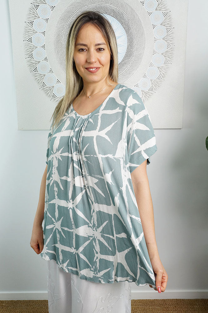 A flowy top with sleeves made from a cool crinkle rayon for those hot summer days. Sizes available 10-16, 18-22