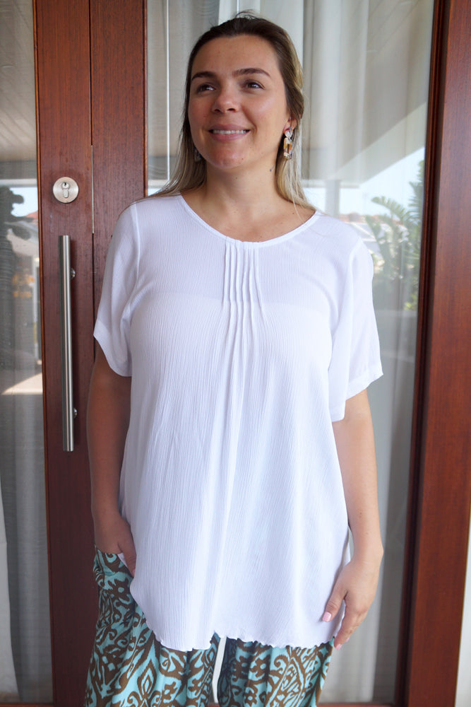 A flowy top with sleeves made from a cool crinkle rayon for those hot summer days. Sizes available 10-16, 18-22