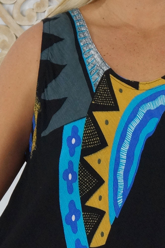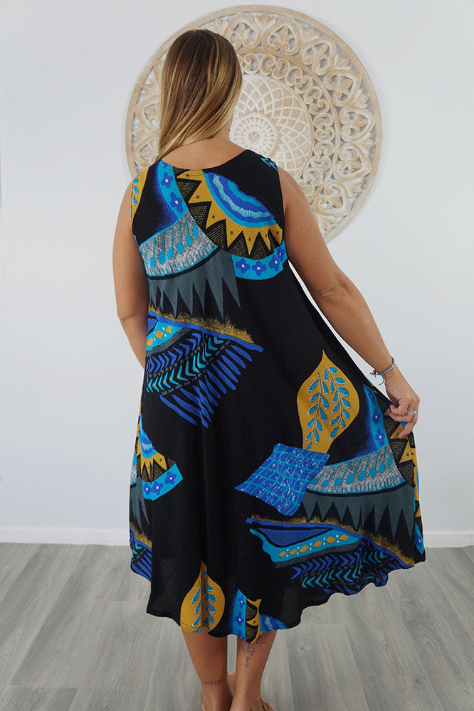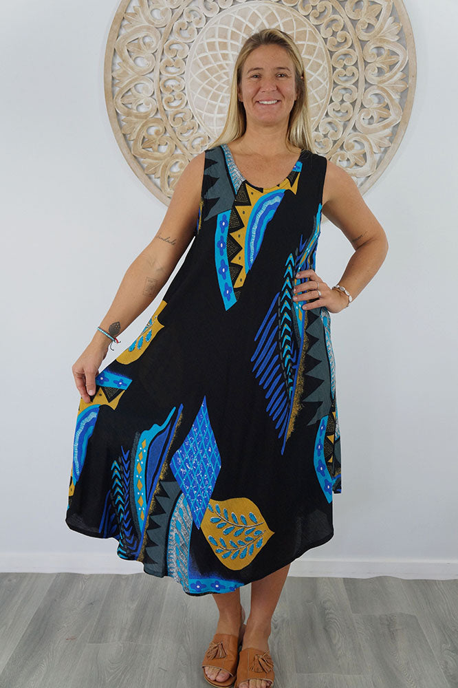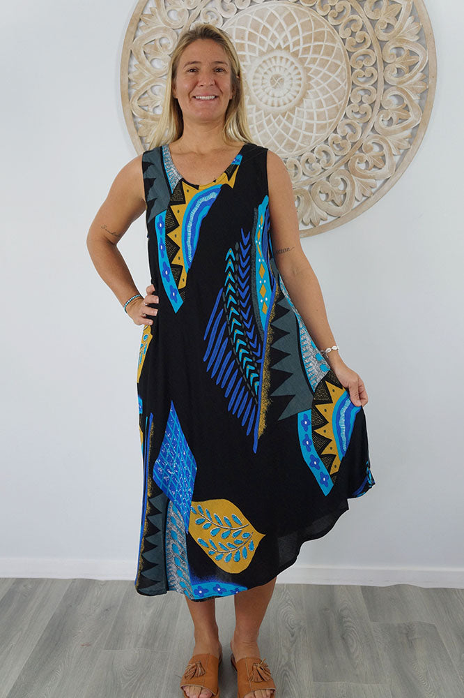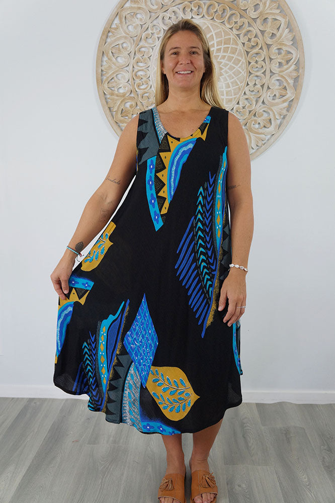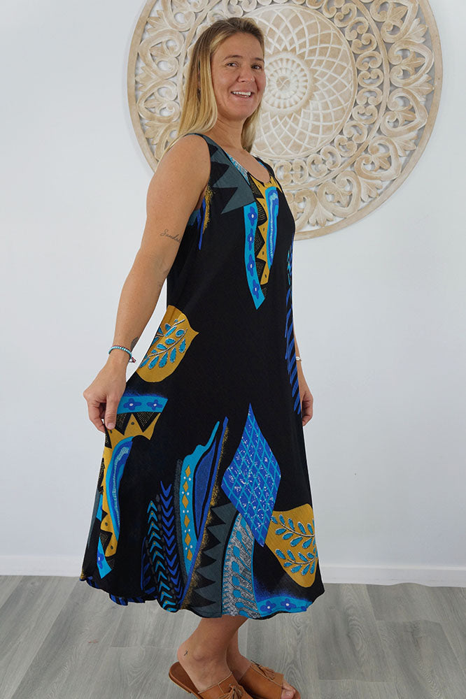 Cool and comfortable sleeveless dress in lovely pre shrunk crinkle rayon. Fabric is cut of the bias to assist the garment to fit many body shapes. Free Sizing 10 - 18.