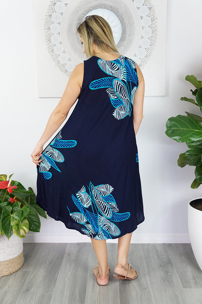 Cool and comfortable sleeveless dress in lovely pre shrunk crinkle rayon. Fabric is cut of the bias to assist the garment to fit many body shapes. Free Sizing 10 - 18.