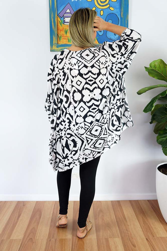 A comfortable way of relaxing around the pool or on the beach, this all rayon tunic is suitable for sizes 10 to 26.
