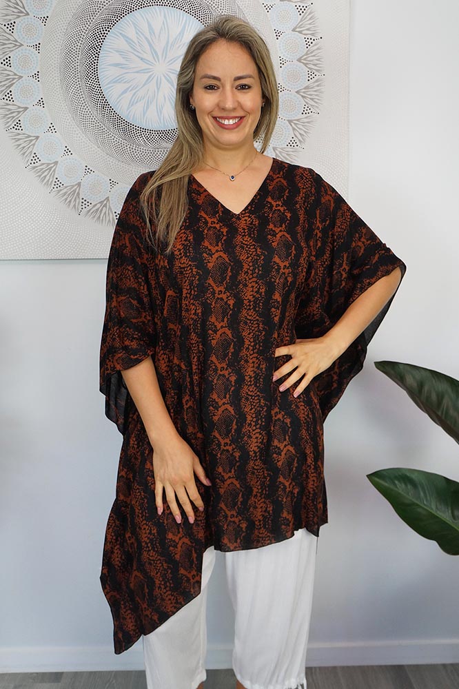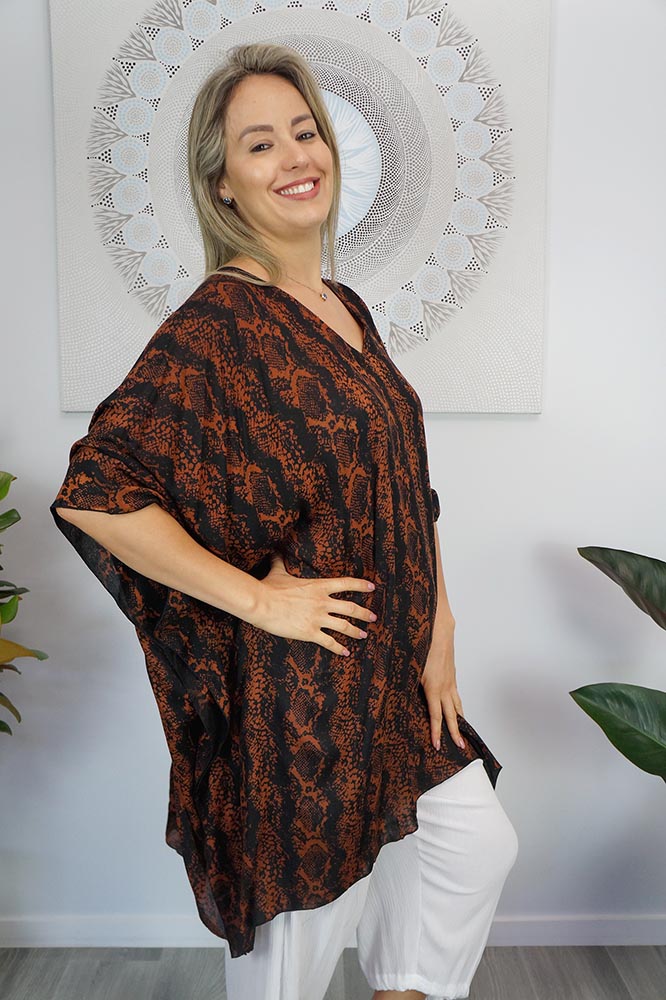 A comfortable way of relaxing around the pool or on the beach, this all rayon tunic is suitable for sizes 10 to 26.