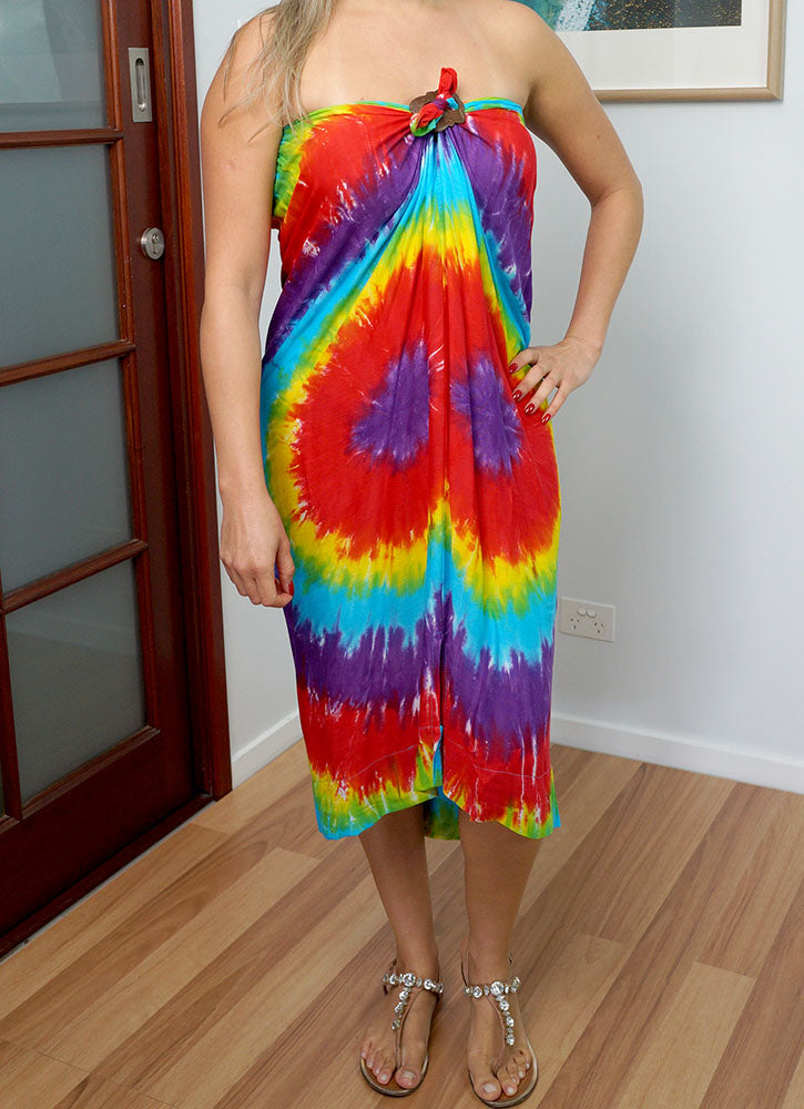 This easy to wear Tie Dye Tube sarong is a great gift for those who may not have the patience to tie sarongs up in the normal way. Features include elastic across the back to make a comfortable fit and complimentary coconut sarong buckle. Made from 100% lightweight rayon fabric.