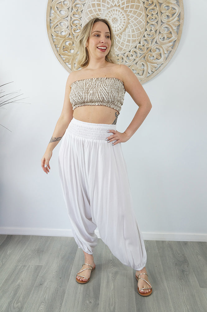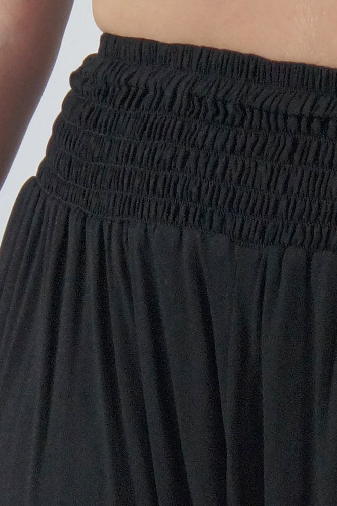 With an elastic shirring waist, low dropping crotch seam and elastic around the ankle this pant is truly comfort for everyday wear. ONE SIZE TO FIT 10-16